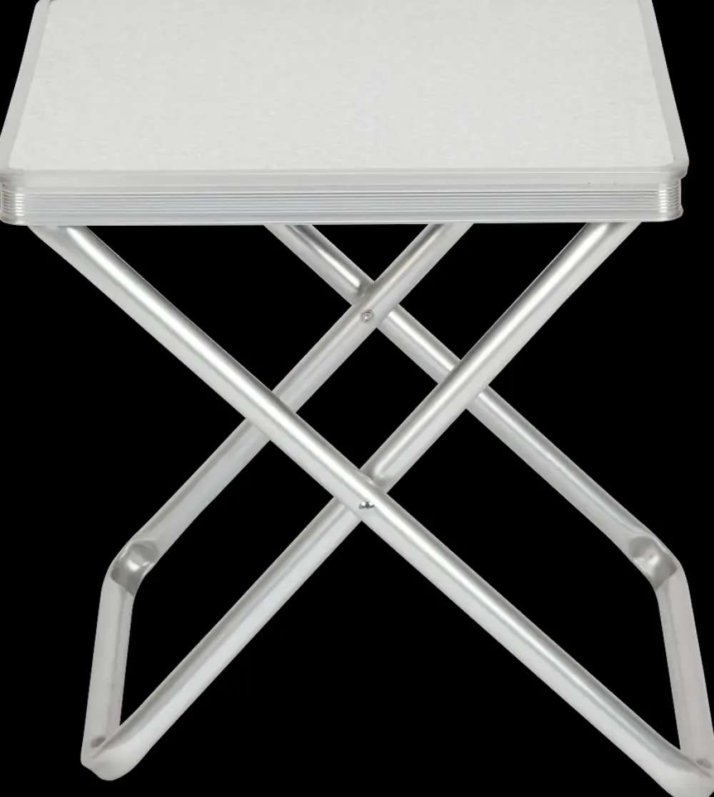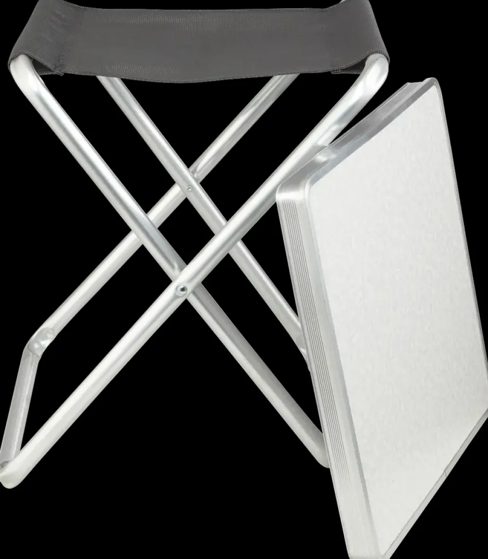 Foldbar skammel i aluminium og med tilhørende bordplade som kan sættes ovenpå sædet og hermed bruges som et lille bord.Maks. belastning bordplade: 30 kg.Maks. belastning skammel: 85 kg.