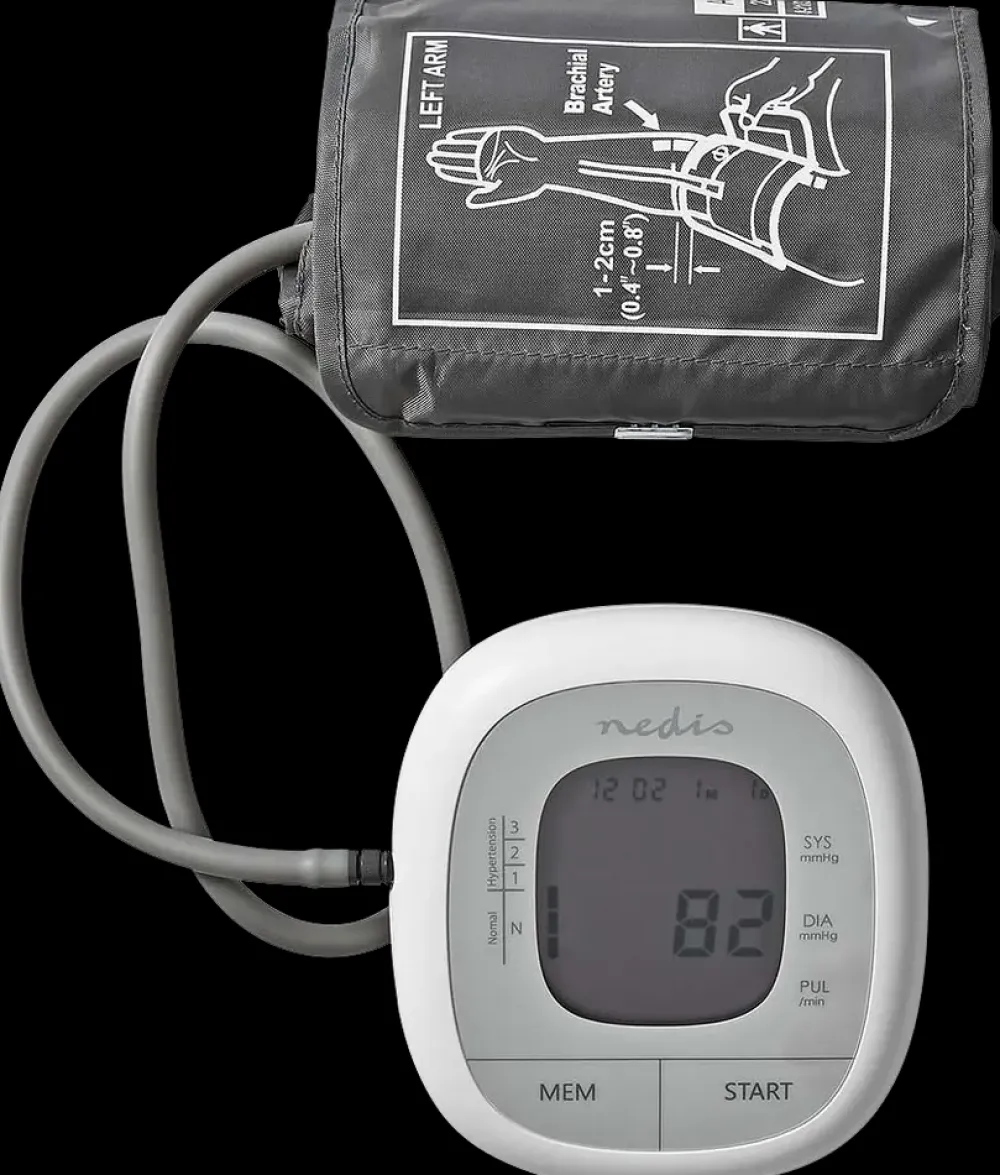 Denne fuldautomatiske blodtryksmåler fra Nedis er beregnet til måling af blodtryk og puls på overarmen. Apparatet er let at anvende og har et stort display, der gør det nemt at aflæse måleresultaterne. Blodtryksmåleren anvender en oscillometrisk målemetode og oppuster automatisk manchetten til korrekt tryk.Blodtryksmåleren har 2 x 60 hukommelsespladser og viser målinger klassificeret efter WHO’s farveskala. Den registrerer desuden uregelmæssig hjerterytme og viser gennemsnitsværdier. Manchetten passer til armomkredse mellem 22 og 42 cm. Enheden slukker automatisk efter 1 minuts inaktivitet og drives af 4 stk. AA-batterier (medfølger ikke).Pakken indeholder blodtryksmåler, manchet, opbevaringspose og brugsanvisning.