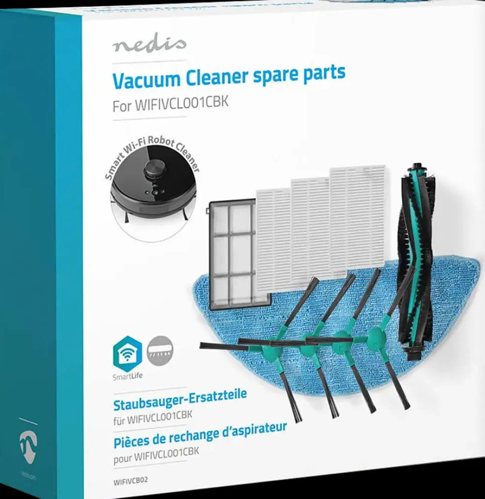 Tilbehørssæt til Nedis robotstøvsuger model WIFIVCL001CBK, varenummer 40349.For længer levetid på robotstøvsugeren anbefaler vi regelmæssigt udskiftning af filter, børste og moppe.Det er let at montere.Æsken indeholder:3 HEPA-filtre1 hoved filter1 rullebørste2 sæt sidebørster1 moppe
