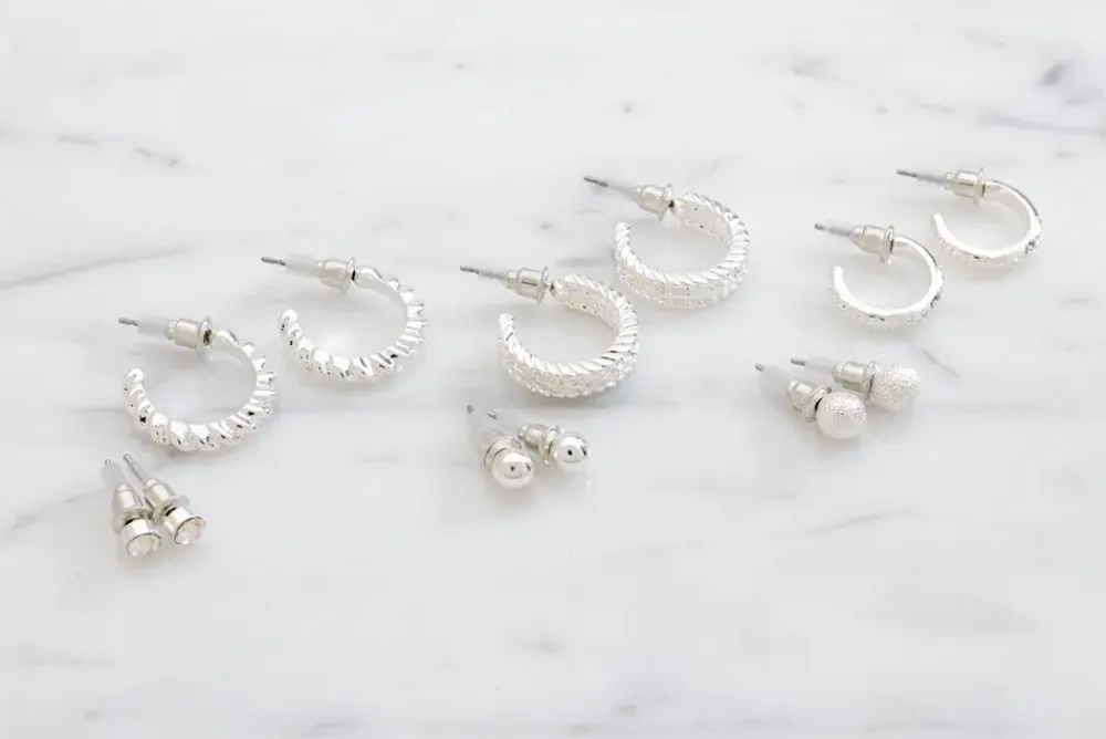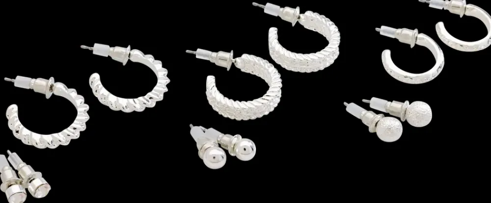 Sæt med 6 par stilfulde øreringe i sølvfarvet finish. Sættet inkluderer tre par hoop-øreringe med forskellige teksturer samt tre par klassiske ørestikker.Perfekt til både hverdag og festlige lejligheder. Øreringene er nikkelfri, hvilket gør dem mere hudvenlige. De er ikke vandresistente og bør opbevares tørt for at bevare deres glans.