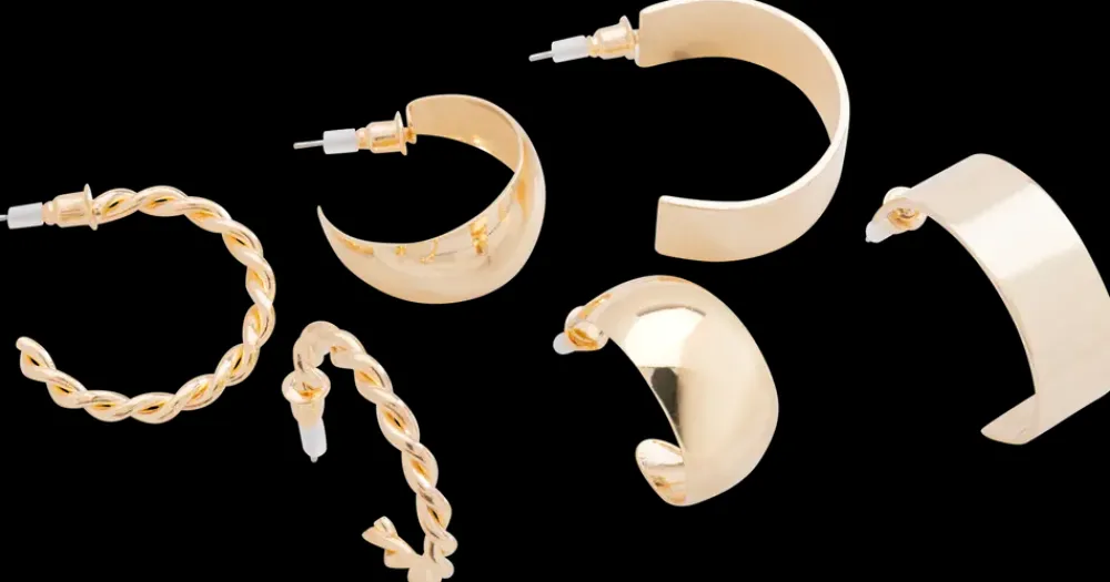 Sæt med 3 par hoop-øreringe i forskellige designs med en smuk gylden finish. Sættet inkluderer et glat klassisk par, et snoet par og et bredere par. Perfekte til både hverdagsbrug og festlige anledninger. Øreringene er nikkelfri og skånsomme mod huden, hvilket gør dem behagelige at bære hele dagen.De er ikke vandresistente og bør opbevares tørt for at bevare deres glans og holdbarhed.