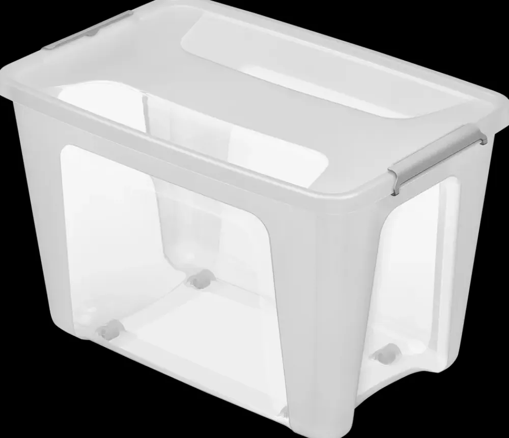 Opbevaringsboks med hjul i god kvalitet, med en konstruktion som gør boksen ekstra stabil. Designet inkludere også håndtag i siderne. Boksene kan stables og har solide lukkeclips.Materialet er fødevaregodkendt.