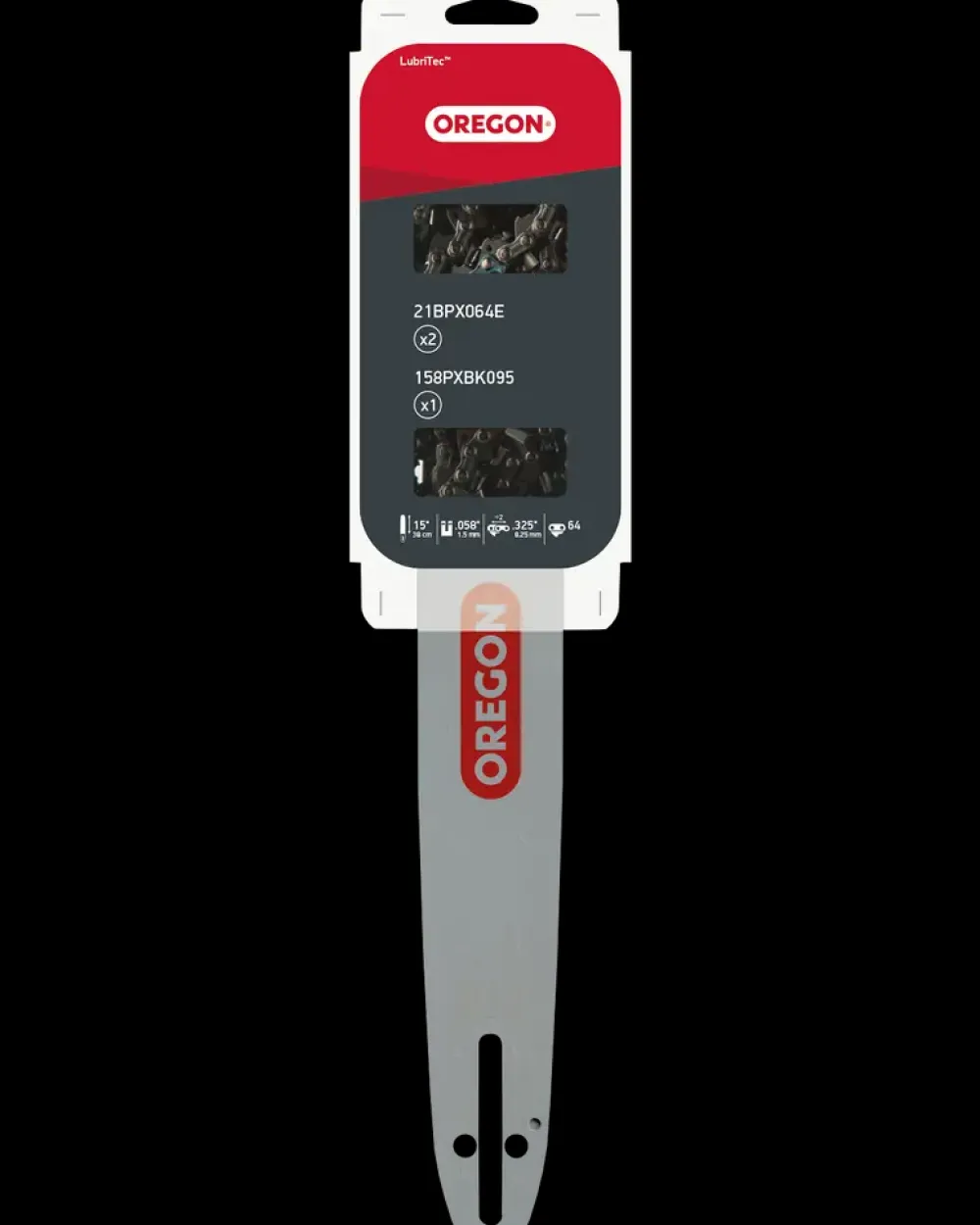 Oregon sværd- & kædesætSværd: Type: AdvanceCut.Model: 158PXBK095.Med næsehjul.Lukket. Antal: 1 stk.Savkæder:Model: 21BPX064E.Kædetype: 0,325″ Prof.Bredde: 1,5 mm.Passer til sværd: 15″, 38 cm.
