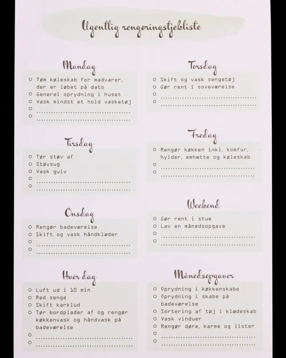 Praktisk ugeplan, som hjælper med at skabe overblik over rengøringen.Med forslag til forskellige rengøringsopgaver i hjemmet, f.eks. støvsugning, opvask og luftning af dyner.Blokken har 52 sider, så der er en side til hver uge i et helt år.