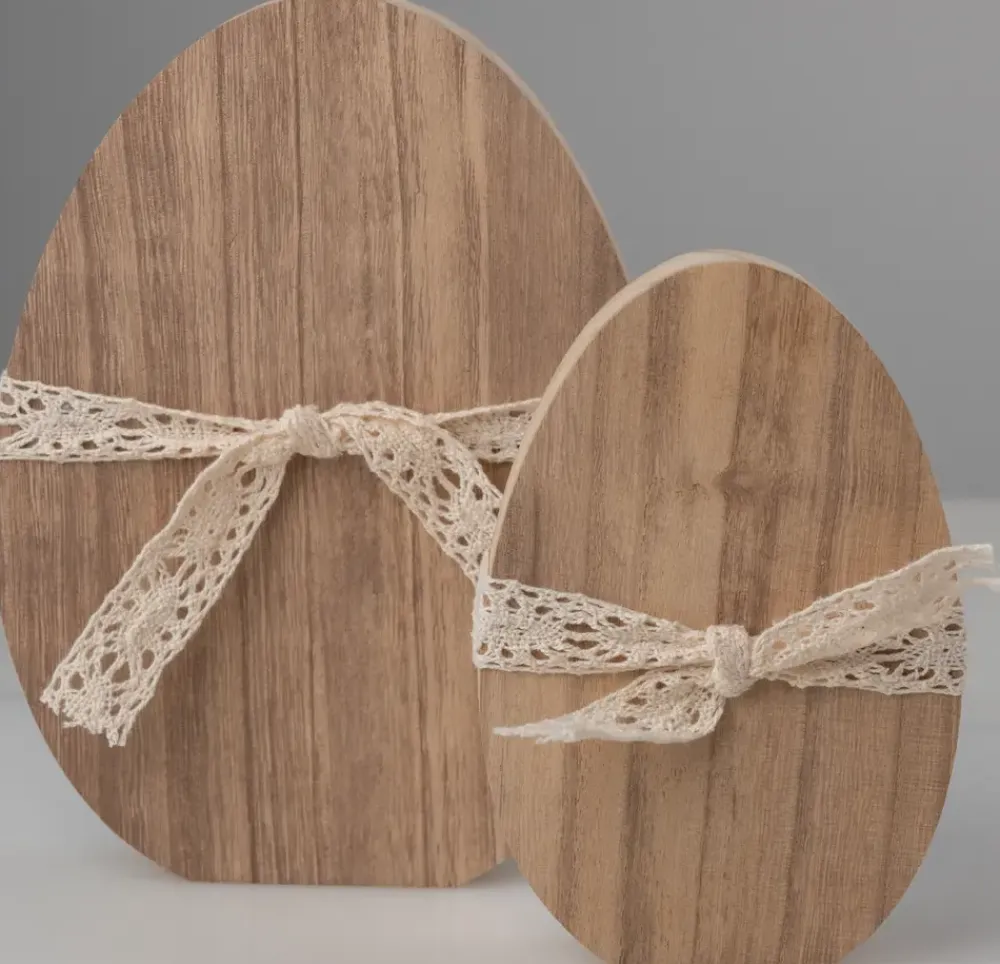 Dekorative påskeæg i træ. Hvert sæt inkluderer to smukt udførte æg i forskellige størrelser, 15 og 20 cm, med bånd. De kan være med til at skabe en hyggelig atmosfære i hjemmet eller som pynt på bordet i påsketiden.