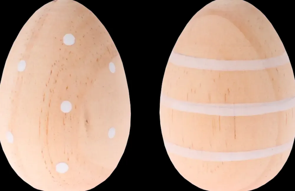 Dekorative trææg i fyrretræ, der skaber en naturlig påskestemning. Velegnede til bordpynt, grendekoration eller kreative DIY-projekter.Findes i to assorterede mønstre: hvide prikker eller striber.Mål: Højde 5,5 cm, diameter 4 cm.Mønster kan ikke vælges ved køb i webshoppen.