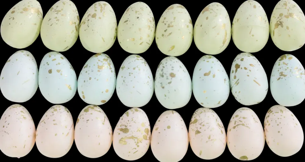 En pose med 24 dekorative påskeæg i elegante pastel farver med gyldne detaljer. Disse æg er velegnet som pynt til påskebordet, i en reol eller som dekorative elementer i potteplanter. Farverne inkluderer blå, grøn og lyserød.Mål: Højde 4 cm, Ø3 cm.