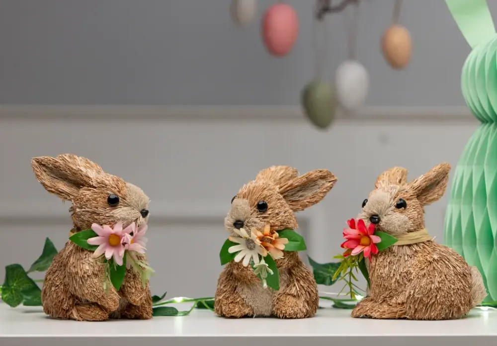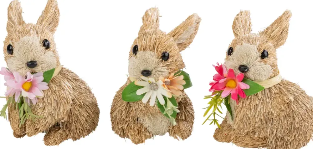 Dekorativ påskehare, der bringer stemning og charme til påskens dekorationer. Disse harer er fremstillet af strå og har en højde på 13 cm. Hver hare er pyntet med en blomst i forskellige farver og findes i tre assorterede varianter.Variant kan ikke vælges ved køb i webshoppen.