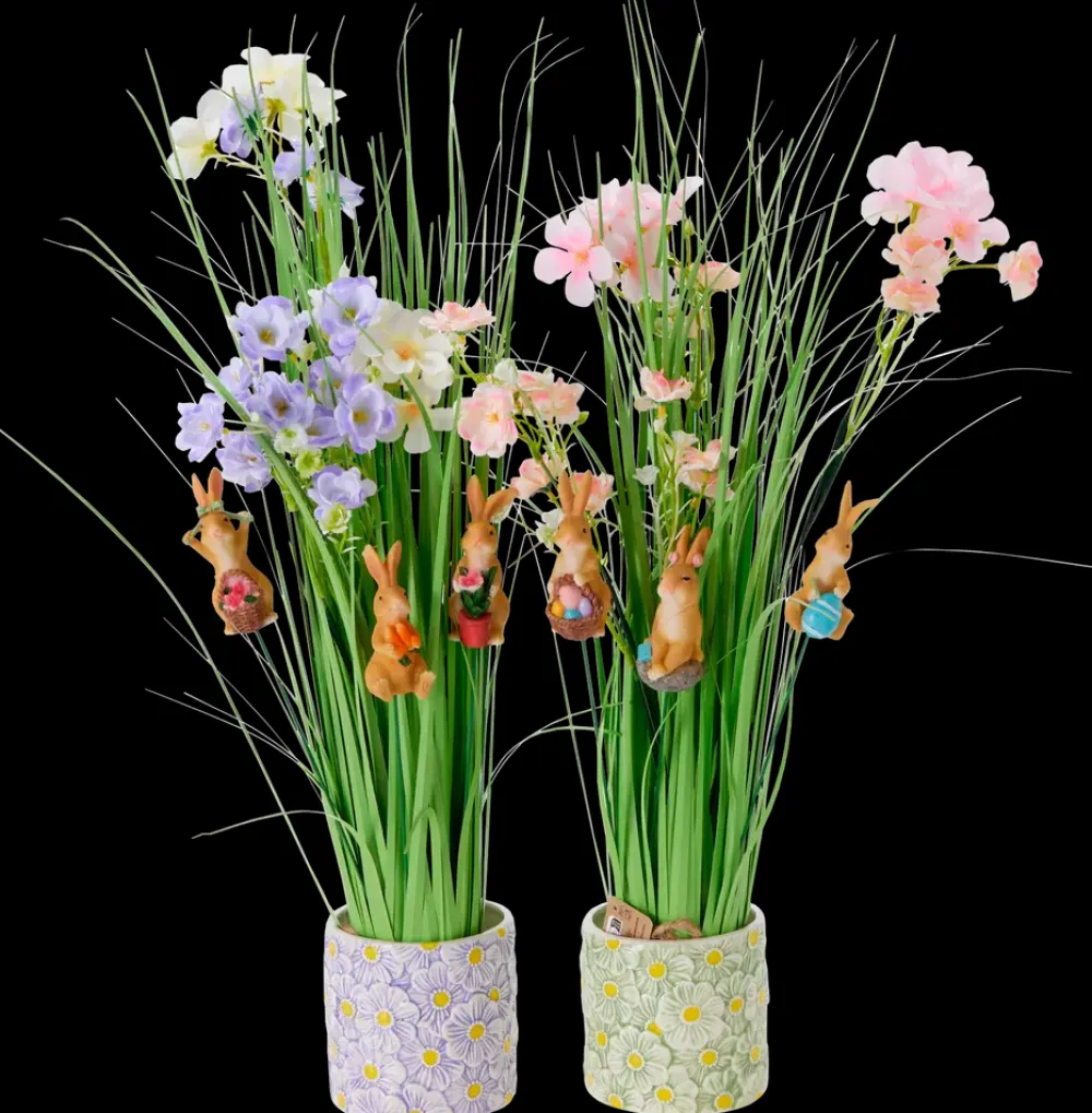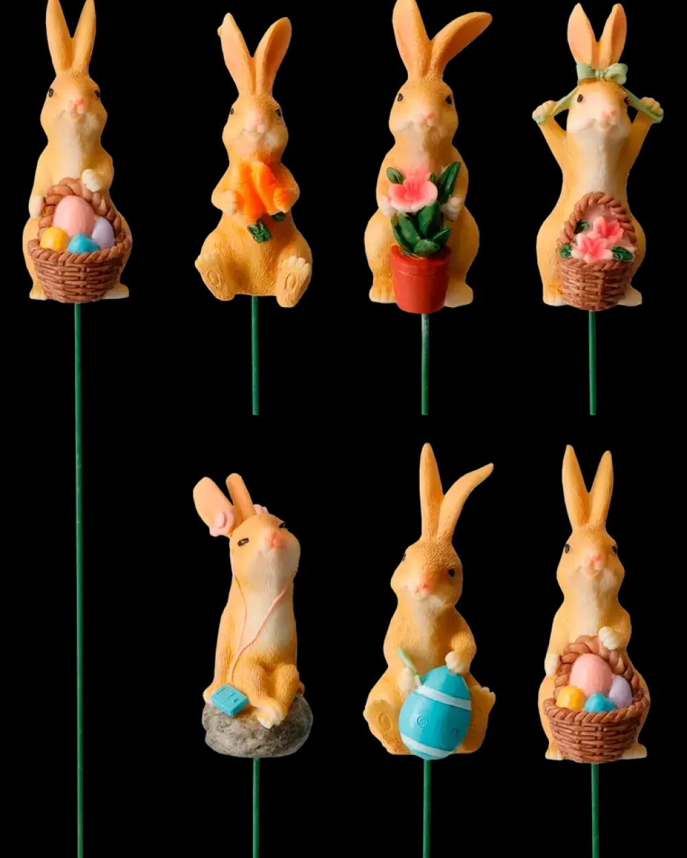 Dekorativ kanin på pind, perfekt til påskedekorationer og blomsterarrangementer. Kaninen måler 5 x 4 cm og er monteret på en 28 cm lang pind, hvilket gør den nem at placere i potteplanter, krukker eller andre dekorationer. De søde kaniner fås i fire forskellige designs med påsketema, herunder motiver med gulerødder, påskeæg og blomster.Bemærk: Designet kan ikke vælges ved køb i webshoppen.