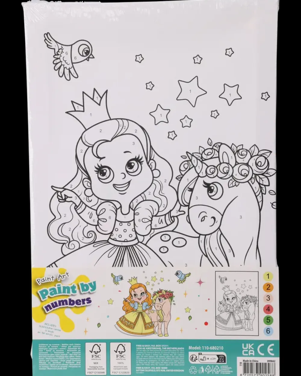 Malesæt, paint by numbers. 195 x 295 mm lærred. Indeholder en pensel, 16,5 cm og 6 små bøtter med 3 ml akryl maling. Findes i 6 forskellige børnemotiver, enhjørning, panda, havfrue, dinosaurus, robot og prinsesse.Det er ikke muligt at vælge motiv i webshoppen.