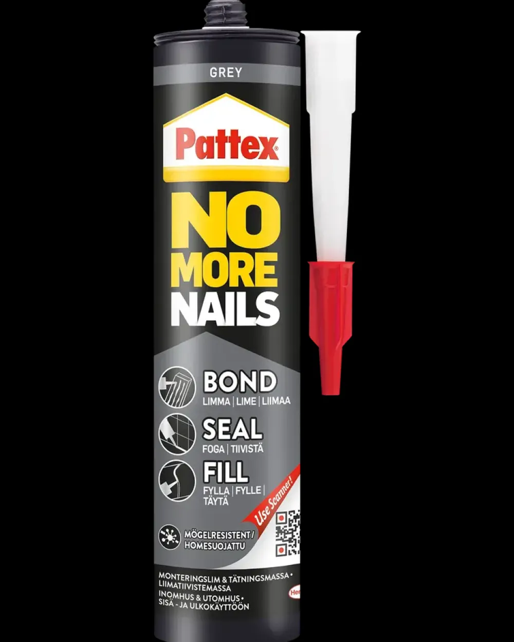 Pattex No More Nails Bond Seal Fill er en kombineret monteringslim, fugemasse og reparationsmasse til både indendørs og udendørs brug. Produktet bruges til fastgørelse, tætning og udfyldning i én arbejdsgang og er velegnet til en lang række opgaver i bolig og værksted.Produktet kan anvendes til montering af blandt andet spejle, paneler, lister og hylder uden brug af søm og skruer. Samtidig egner det sig til fugning omkring karme, fliser, vinduer og kanter, hvor der er behov for en ensartet og tæt afslutning. Ved reparation kan massen bruges til at udfylde revner og mindre huller med et jævnt resultat.Produktet er egnet til brug både inde og ude og er modstandsdygtigt over for fugt og skiftende vejrforhold.Tekniske detaljer og målAnvendelse: Lim, fuge og fyldBrug: Indendørs og udendørsPatrontype med dyse