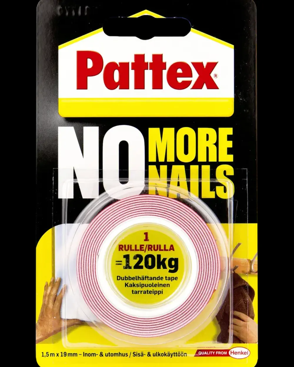 Pattex No More Nails Tape er en dobbeltklæbende tape til montering uden brug af søm eller skruer. Tapen anvendes til fastgørelse af genstande på både indendørs og udendørs overflader, hvor der ønskes en ren og hurtig løsning uden boring.Tapen giver en stærk vedhæftning og kan bruges til ophængning af eksempelvis billeder, kroge og lettere tilbehør. Monteringen foregår ved, at tapen påføres den ønskede flade, hvorefter emnet trykkes fast. Løsningen egner sig til situationer, hvor der stilles krav til hurtig montering og et pænt resultat uden synlige fastgørelsesmidler.Den dobbeltklæbende konstruktion er vandfast og vandtæt, hvilket gør tapen anvendelig både inde og ude. Ifølge angivne oplysninger kan én rulle klare belastning op til 120 kg, afhængigt af overflade og korrekt montering.Tekniske detaljer:Længde: 1,5 meterBredde: 19 mmAnvendelse: Indendørs og udendørsMaks. belastning: Op til 120 kg