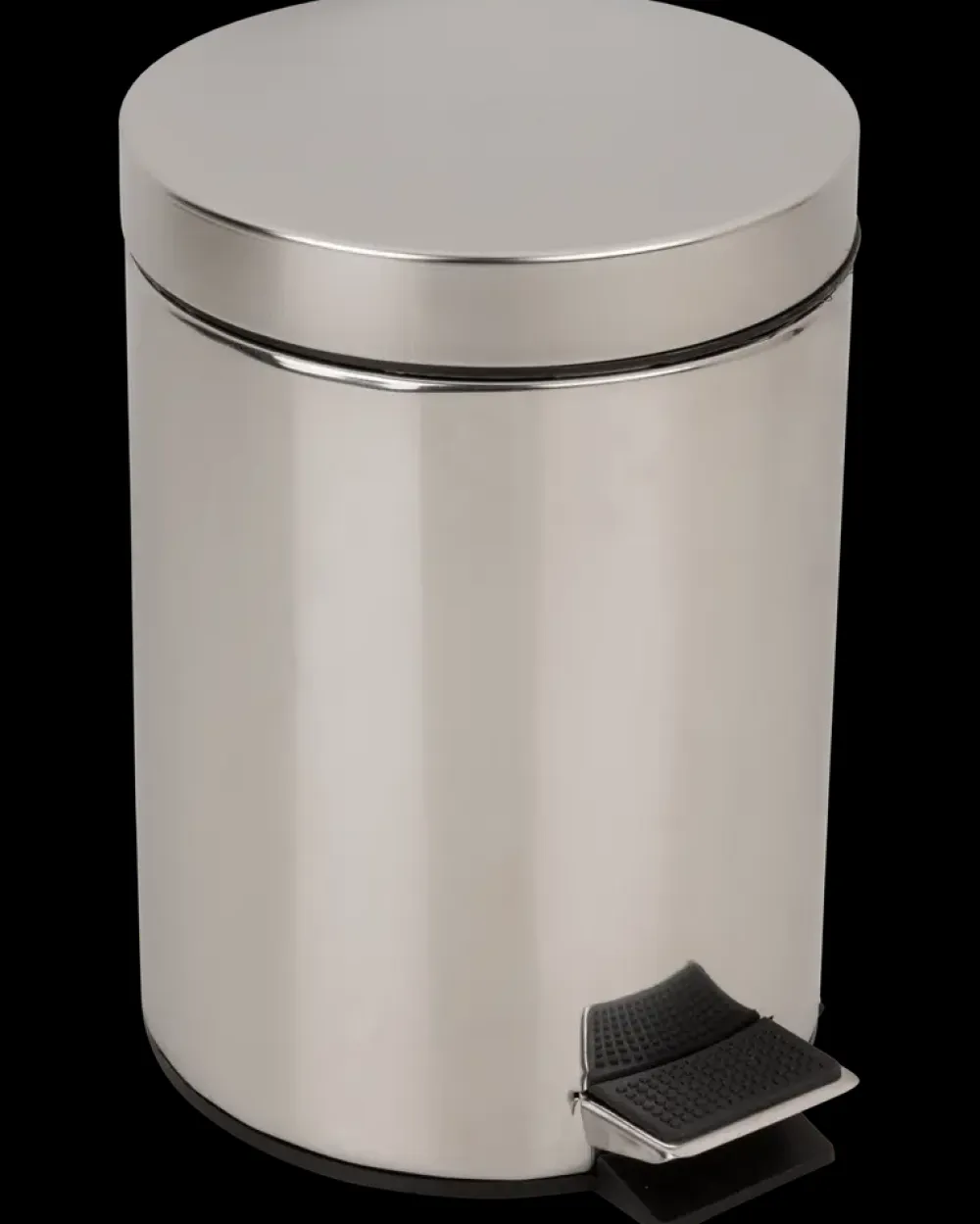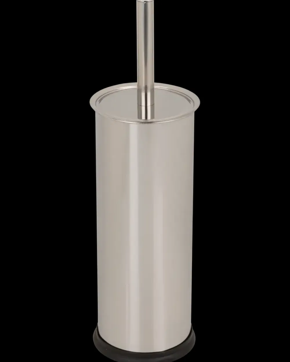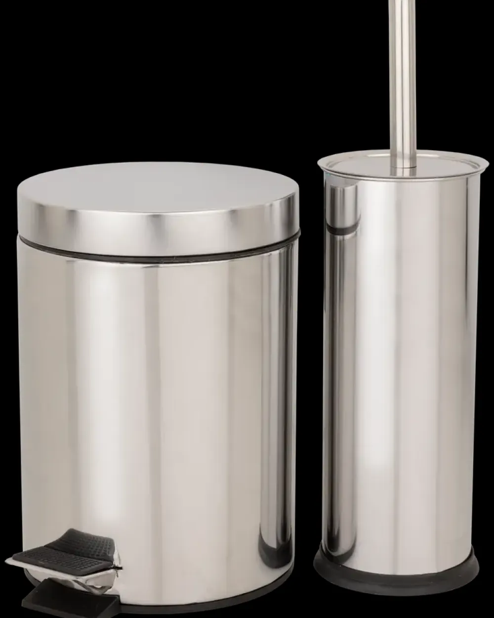 Toiletsæt i rustfrit stål med blank spejlfinish. Består af pedalspand og toiletbørste i enkelt, cylinderformet design, der passer godt til moderne badeværelser.Pedalspanden har rillet fodpedal og indvendig plastspand, som nemt kan tages ud og rengøres. Toiletbørsten er skjult i en lukket beholder med matchende design.Begge dele har sorte gummikanter i bunden, som beskytter gulvet og giver stabilitet. Det rustfrie stål sikrer høj slidstyrke og modstand mod fugt.Pedalspanden har en kapacitet på 3 liter og en højde på 24,3 cm