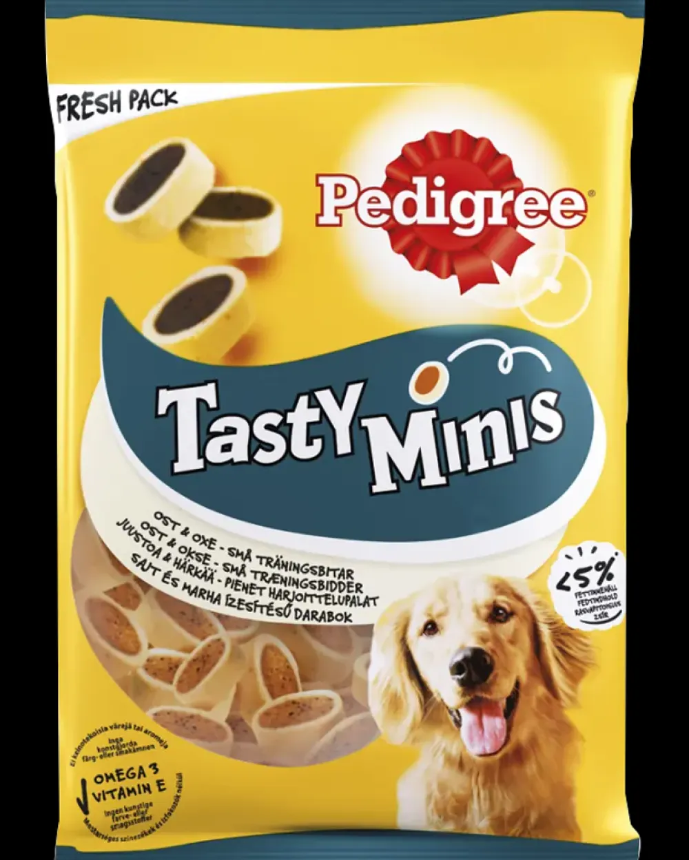 Pedigree® Tasty Minis hundegodbidder er perfekte små bløde bidder, som er nemme at tage med på turen eller til træning, og som du hurtigt kan give til din hund for at belønne den. Disse kødfyldte godbidder er tilsat vitaminer, mineraler og omega-3 fedtsyrer, så du kan føle dig helt sikker på, at din hund får et ekstra skud næring. Pedigree Tasty Minis Cubes hundegodbidder indeholder hverken kunstige farve- eller aromastoffer og er velegnede til både store og små hundemunde.Til både store og små hunde.Smag: Ost og okse.Omega-3 og vitaminer.