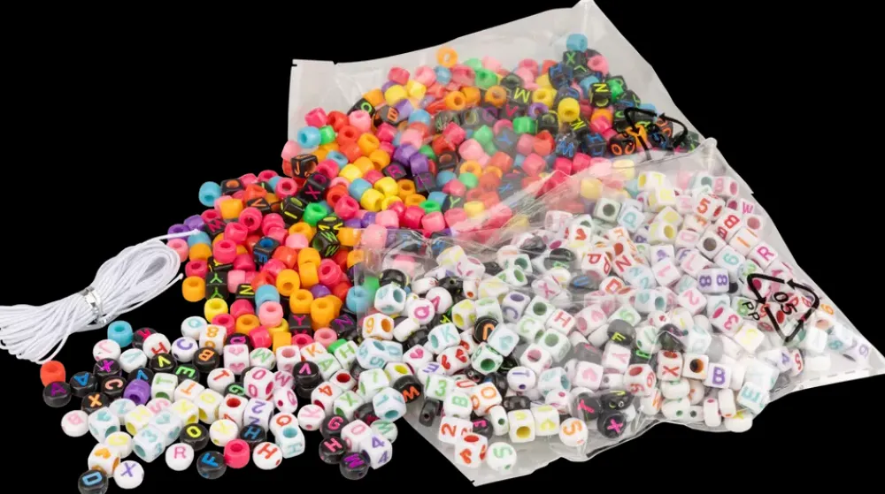 Sæt med perler til kreative projekter, hvor der kan laves navne, korte ord eller små dekorationer. Indeholder alfabetperler, farvede perler i blandede former samt elastiksnor til montering. Egner sig til simple hobbyaktiviteter for både børn under opsyn og voksne.Perlerne leveres i en gennemsigtig spand med låg, som gør det let at holde styr på indholdet og se farverne.Antal: 1000 stk.