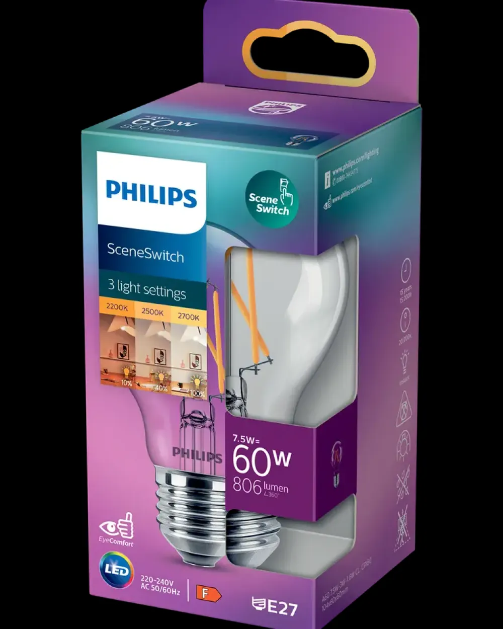 Med denne topmoderne LED pære får du den optimale belysningsløsning til hjemmet. Spar penge på strømudgifterne med det samme, og skift pære sjældnere uden at gå på kompromis med lyskvaliteten.Effekt: 7.5-3-1.6 watt.Lumen: 806-320-150lmKelvin: 2700/2500/2200KEyeComfort: Ja.Dæmpbar: Ja (SceneSwitch).Warm Glow / Dim Tone: Ja (3 steps): 2700/2500/2200K.Må anvendes i åbent armatur.Skal ventileres: Ja.