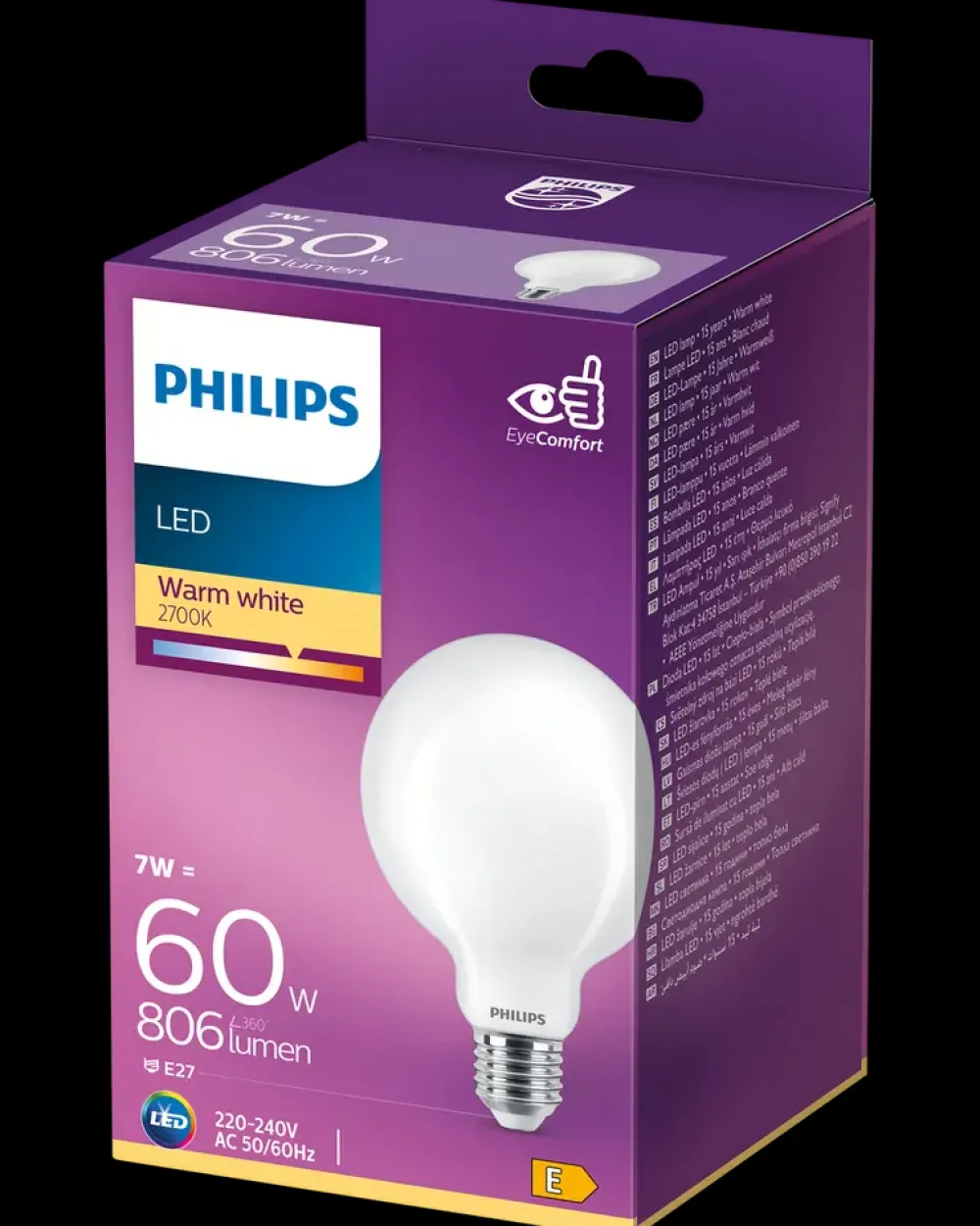 LED-pære med E27-sokkel er velegnet til lamper og armaturer, hvor der ønskes en varm og behagelig belysning.Pæren har en lysstyrke på 806 lumen og et varmt hvidt lys på 2700K, svarende til en 60W glødepære – men med et lavt forbrug på kun 7W. Lyset fordeles jævnt i 360°.Pæren er i energiklasse E og har en levetid på op til 15.000 timer. Ikke dæmpbar.