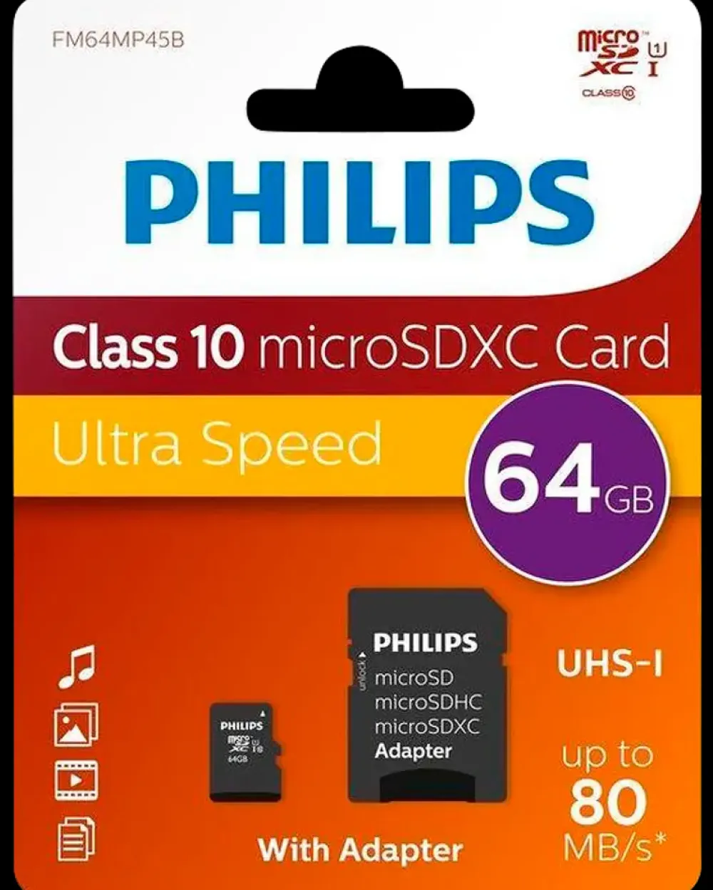 Læsehastighed på op til 80 MB/s.Dette Philips micro-SDXC hukommelseskort har nok plads til sikkert at opbevare alle dine fotos, videoer, musik og data.Nok kapacitet til at opbevare ca. 18000 af dine yndlingsbilleder eller 640 minutter video i Full HD.Ultra Speed.Klasse 10.Op til 80 MB/s.Android® 4.0 og nyere.Windows® XP og nyere.Mac® OS 9.0 og nyere.Linux® 2.4.0 og nyere.