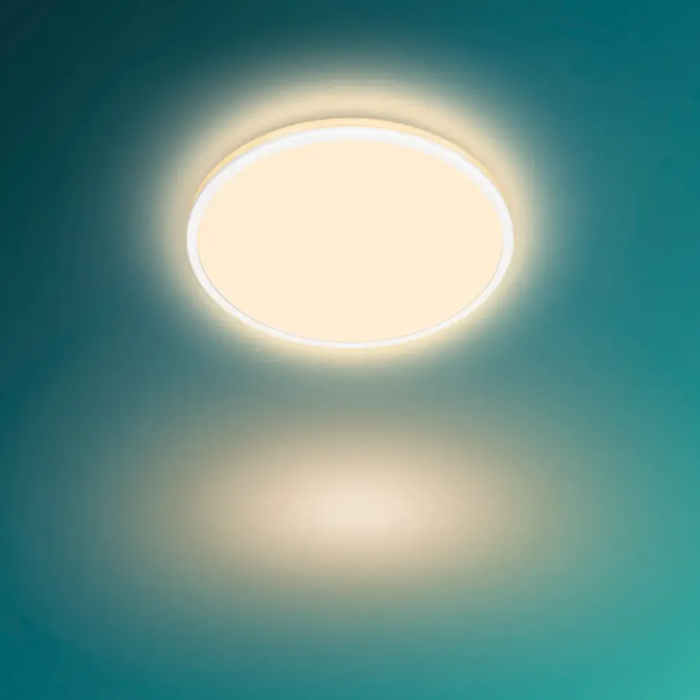 Denne tynde, hvide loftslampe er designet med 3-trins-lysfunktion der justeres via almindelig afbryderkontakt. Juster dit lys i 3 lysstyrker.De rene, runde linjer fra det primære lys fremhæves af et smart, lineært kantlys.Praktisk hukommelsesfunktion, der genkalder din sidste indstilling.Omhyggelig placering af forskellige lyskilder i dit hjem og spil med lag af lys hjælper med at skabe en fornemmelse af plads og give rummet en varm og indbydende atmosfære.Det slanke design er ideelt til lavloftede rum, fordi det går ud i ét med overfladen.Lav den rette stemning til både koncentrations- og hyggestunder. Ingen lysdæmper eller installation påkrævet. Det eneste, du skal bruge, er din eksisterende vægkontakt.Dæmpbar: Ja i 3-trin.Benytter 1 stk. pære der har energiklasse E (A-G). Lyskilde er ikke udskiftelig.
