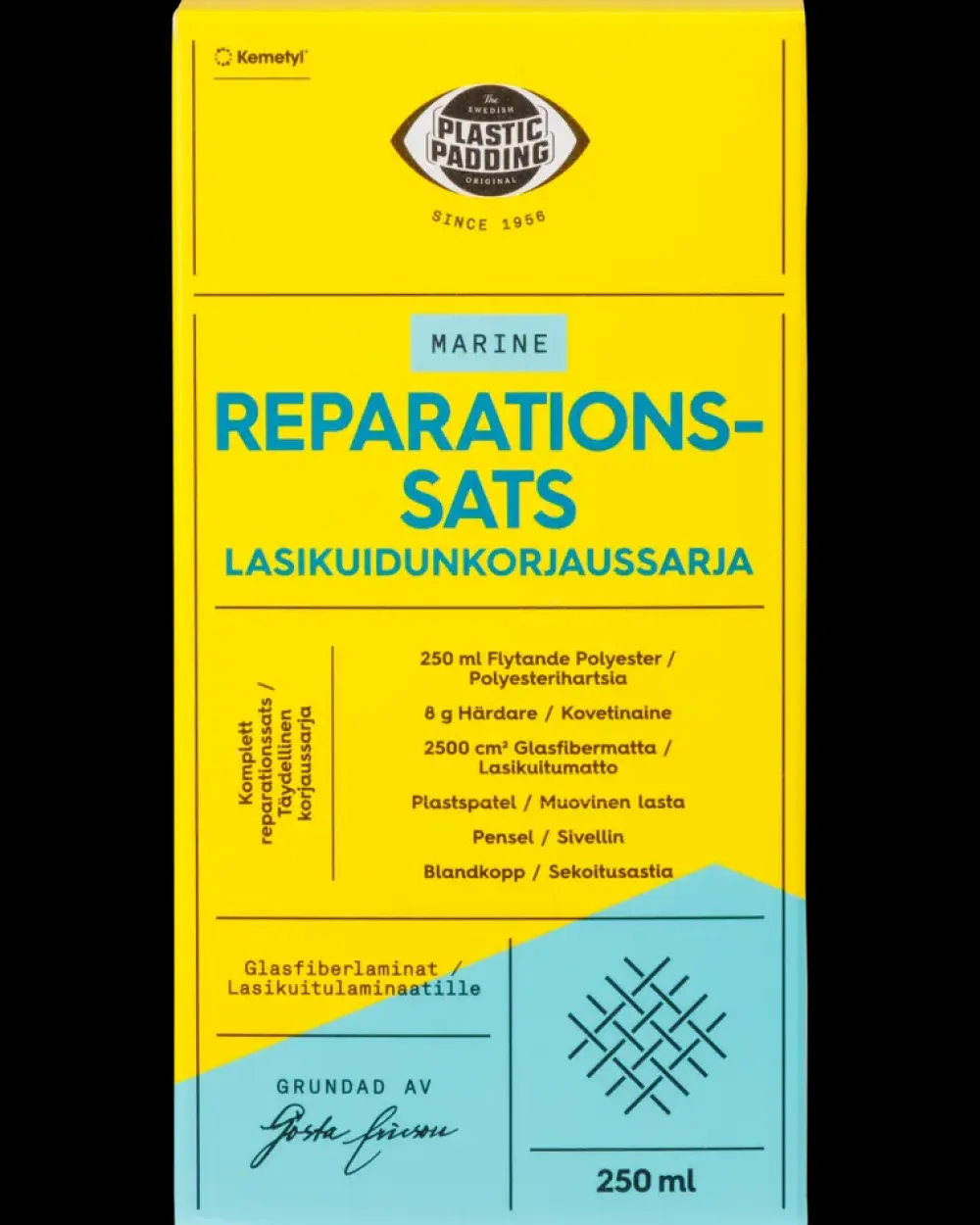 Komplet glasfiber reparationssæt.Alt i ét! Reparationssættet indeholder alt, hvad man har brug for til at reparere plastbåde, surfbrætter, snescootere og tagbokse lavet af ABS-, epoxy- eller polyestermaterialer.Reparerer revner og skader på glasfiberplast og andre materialer. Også fremragende til sammenføjning af forskellige materialer.Pakken indeholder:Båd plast polyester harpiks 250 ml.Hærder 8 g.Glasfibermåtte 2500 cm².Blandet kop.Pensel.