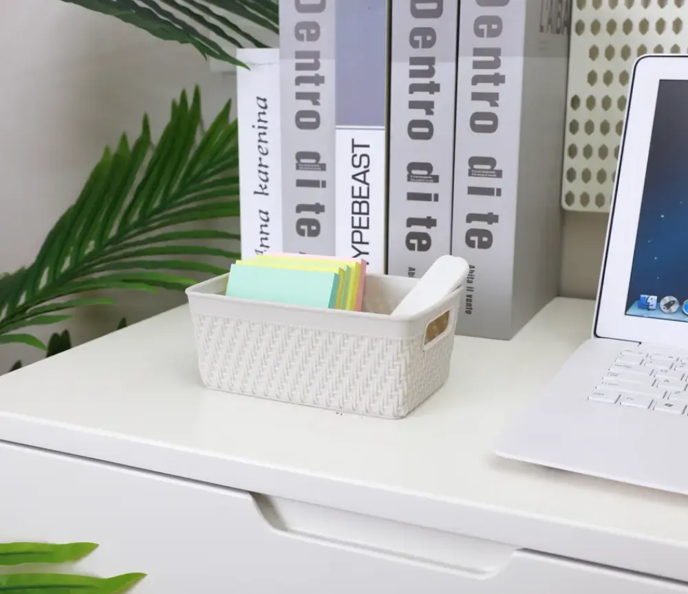 Denne flettede plastikkurv byder på mange opbevaringsmuligheder, lige fra kontorartikler til legetøj på børneværelset.Kurven er lavet i et fletdesign, der giver et moderne og hjemligt look, så det passer ind i de fleste boligindretninger og kommer i en lys og frisk farve.Opbevaringskurvens materiale gør, at den er nem at gøre ren.