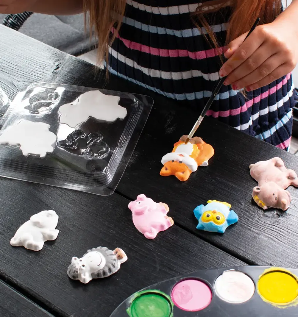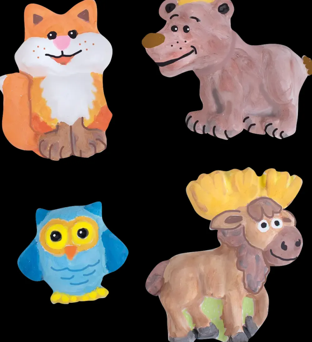 Gips forme med fire forskellige skovdyr: ræv, bjørn, ugle og elg.Når gipsen er tørret, kan du farve dyrene med vand eller akrylmaling. Lav magneter eller leg med figurerne, som de er.Farve: Transparent.Materiale: PET.