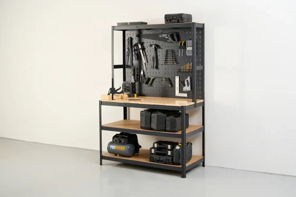 Probuilder arbejdsbord med værktøjsvæg og hylder er udviklet til værksted, garage og hobbyrum, hvor der er behov for en stabil arbejdsstation og organiseret opbevaring. Kombinationen af træbordplade og pulverlakeret stålkonstruktion giver en solid og fast arbejdsflade til både montage- og reparationsopgaver.Værktøjsvæggen er perforeret og leveres med 35 kroge, så håndværktøj kan ophænges overskueligt og inden for rækkevidde. De tre MDF-hylder under bordpladen giver ekstra opbevaringsplads til maskiner, kasser og tilbehør. Hver hylde har en maksimal belastning på 175 kg, hvilket gør reolen velegnet til tungere emner.Bordpladen er udført i træ og måler 180 x 60 cm. Den samlede konstruktion måler 180 x 120 x 60 cm.Farve: Sort og træMateriale: Stål og træAntal kroge: 35 stk.Antal hylder: 3 stk.Maks. belastning: 175 kg pr. hylde