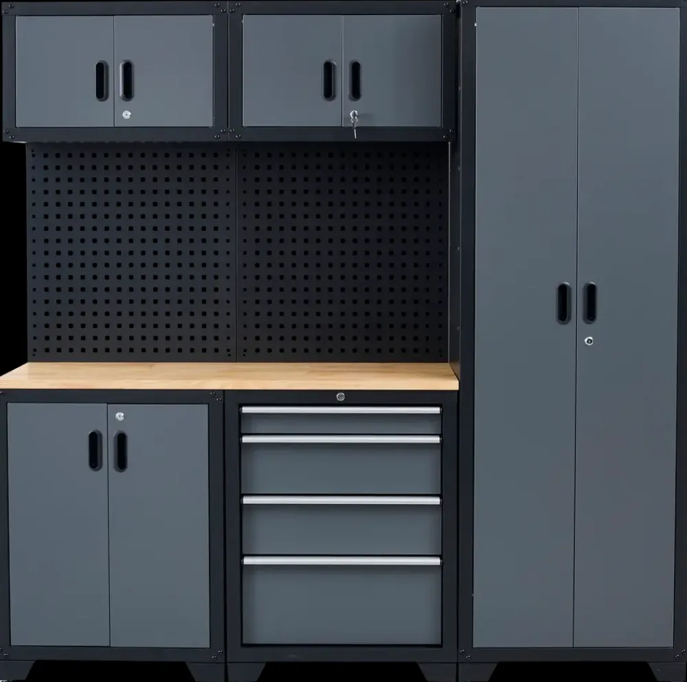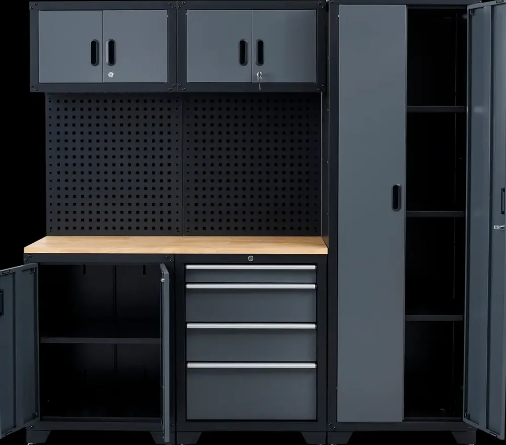 Opbevaringsløsning lavet i stål og træ.Velegnet til f.eks. værksted og garage.Sættet indeholder følgende moduler: Højskab med 2 låger og 3 hylder: 66 x 45,8 x 200 cm.2 stk. overskabe med låge: 66 x 40,9 x 30,5 cm.Underskab med låger og hylde: 66 x 45,8 x 78,7 cm.Modul med 4 skuffer: 66 x 45,8 x 78,7 cm. Bordplade i massivt træ: 132 x 46 x 2,5 cm.2 stk. bagplader med huller til kroge: 72 x 66 cm.Krogesæt med 10 dele.Flat pack / Knock down: Saml-selv.Alle låger og skuffer kan låses. Inkl. 2 nøgler. H. 1981 x B. 1980 x D. 457 mm.Materiale: Stål og træ.Farve: Sort og grå.