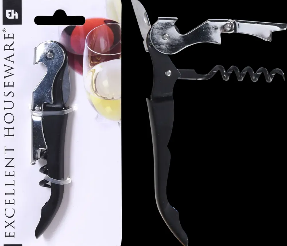Proptrækker med tre funktioner. Folieskærer, oplukker og proptrækker.Sort metalhåndtag i rustfrit stål.