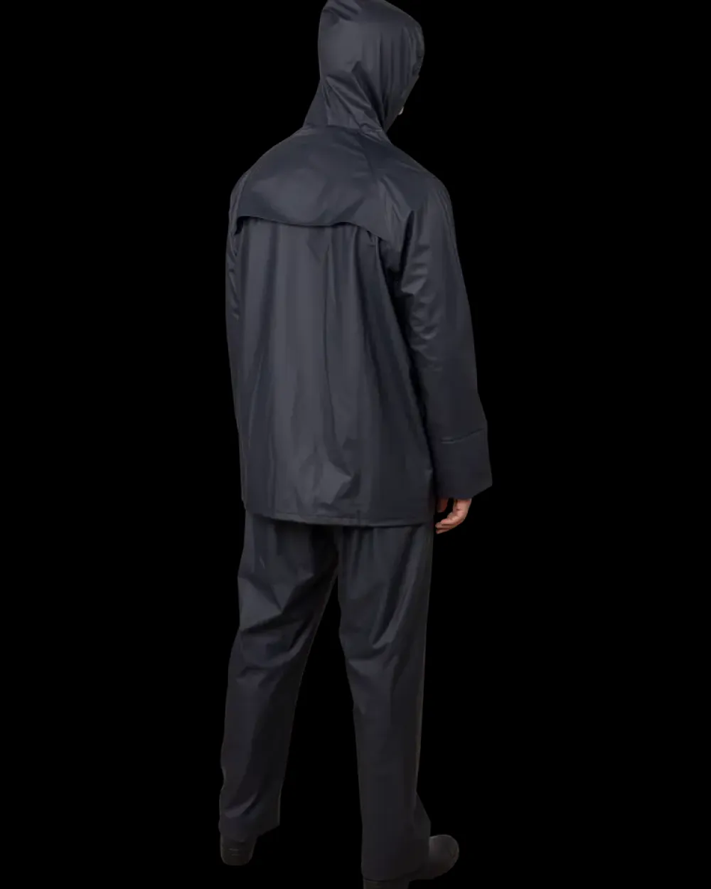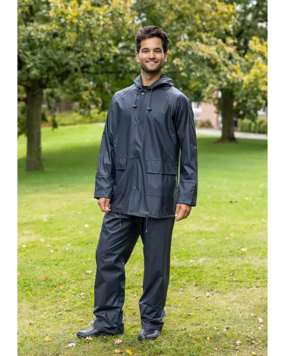 Regnjakke med hætte, lynlås og trykknaplukning. Benklæder med elastik i talje og trykknaplukning ved anklen. Materiale: PU belagt polyester.Kan finvaskes ved 40°.