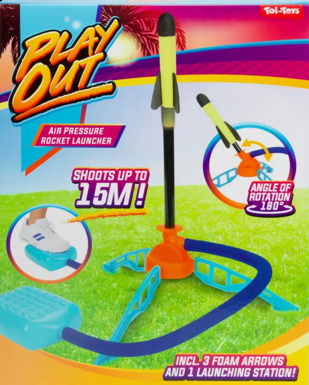Luftdrevet raket til udendørs leg, der affyres ved hjælp af en fodpumpe. Raketten placeres på affyringsbasen og sendes af sted, når der pumpes luft gennem slangen. Affyringsvinklen kan justeres, så raketten kan skydes i forskellige retninger.Fodpumpen giver mulighed for at variere kraften i affyringen, hvilket påvirker rakettens højde og længde. Raketten er udført i skum og har fastmonterede finner samt afrundet top. Affyringsbasen står stabilt på tre ben og er forbundet til pumpen med en fleksibel slange.Produktet er velegnet til leg i haven eller på åbne områder med god plads.Farver: blå, orange, gulMateriale: EVAC, PP, PE, PVC