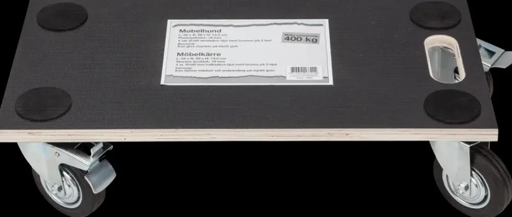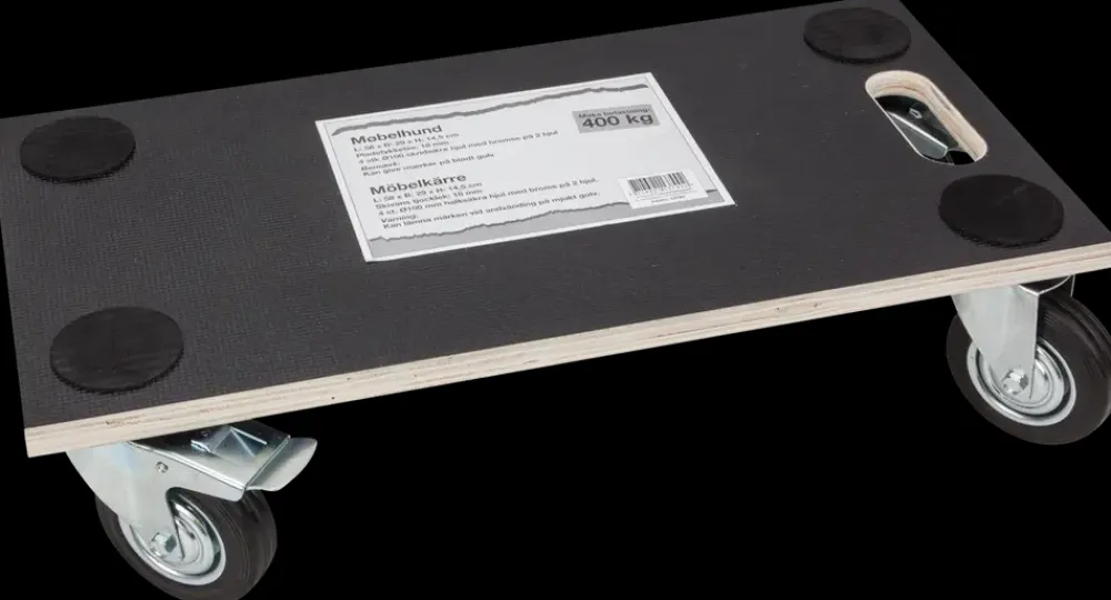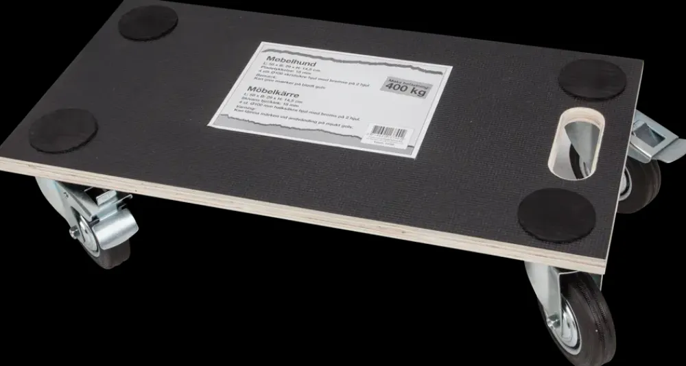 Gør flytningen lettere med en møbelhund. Du kan nemt flytte tunge ting på den store plade med de 4 hjul. Der er bremse på 2 af hjulene.Pladen er lavet i poppel krydsfiner med melamin puder, puderne gør at tingene står bedre fast.Materiale på plade: Poppel krydsfiner med melamin puderPladetykkelse: 18 mm.Materiale på hjul: Gummi og stålHjulstørrelse: Ø. 100 mm.Bemærk: Kan give mærker på blødt gulv.
