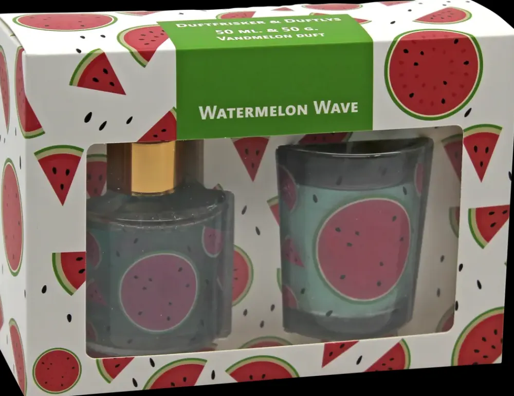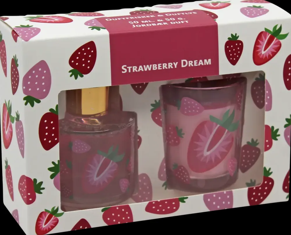 Sæt i glas med dekorative frugtmotiver. Indeholder en duftfrisker (50 ml) og et duftlys (50 g). Vælg mellem jordbær, citrus, vandmelon eller ananas. Glassene er transparente med trykte motiver, der matcher duften. Duftfriskeren giver en vedvarende aroma, mens lyset tilføjer både duft og belysning.Indhold: Duftfrisker (50 ml) og duftlys (50 g).Variant kan ikke vælges ved køb i webshoppen.