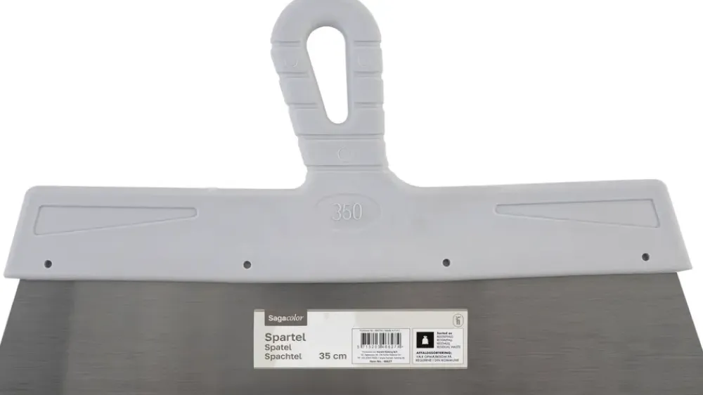 Spartel på 35 cm anvendes til påføring og udjævning af spartelmasse på større overflader. Den brede klinge gør det muligt at fordele materiale jævnt og effektivt, hvilket er velegnet til vægge og lofter ved klargøring før maling eller tapet.Klingen kan også bruges til at skrabe maling, fjerne tapetrester og løs spartelmasse samt til mindre reparationsopgaver som udfyldning af revner og huller. Den brede arbejdsflade bidrager til færre strøg og ensartet resultat ved større flader.Håndtaget er udført i plast med ophængningshul, hvilket gør opbevaring enkel. Klingen er fremstillet i stål med en tykkelse på 0,5 mm, som giver en stabil og fleksibel arbejdsflade.Mål: 350 x 200 x 10,5 mmKlingebredde: 35 cmMateriale: PP-håndtag, stål klingeFarve: grå og metal