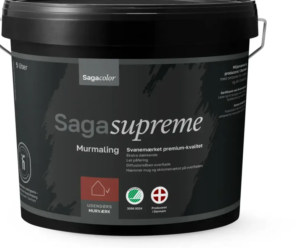 Sagasupreme Murmaling er en helmat maling til udendørs murværk, hvor der ønskes en diffusionsåben og vejrbestandig overflade. Malingen er velegnet til mineralske facader som puds, beton og tegl samt tidligere malede overflader, hvor underlaget kan være let porøst eller svagt afsmittende.Overfladen tillader murværket at ånde, hvilket reducerer risikoen for fugtopsamling, samtidig med at den virker smudsafvisende. Sammensætningen hæmmer udvikling af mug- og skimmelvækst på overfladen og bidrager til et ensartet, roligt udtryk med mat finish.Murmalingens holdbarhed er angivet til op til 12 år ved korrekt forbehandling og påføring. Den kan anvendes ved både nybyggeri og renovering og påføres med pensel eller rulle. Optimal dækning og levetid opnås ved to behandlinger.Tekniske detaljerIndhold: 5 literGlans: MatRækkeevne: ca. 8 m² pr. literFortynding og værktøjsrens: vandFarve: GråProduceret i Danmark af Flügger.