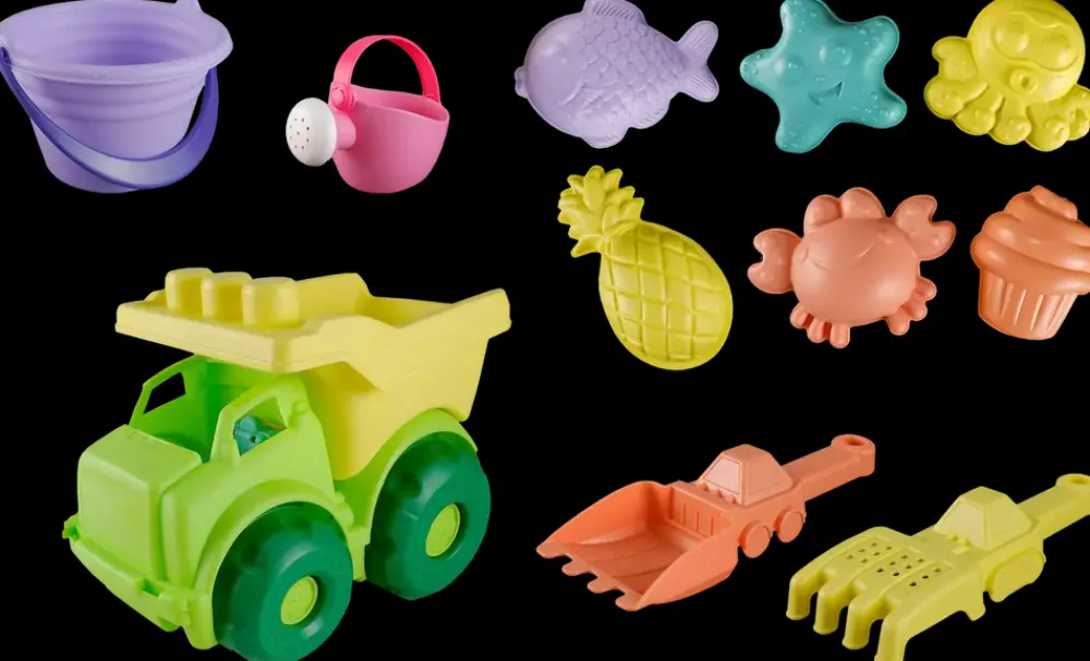 Flot sæt med 11 stk. sandlegetøj.Der medfølger 1 lastbil, 1 spand, vandkande, 6 sandforme (fisk, søstjerne, blæksprutte, ananas, krabbe og cupcake), rive samt 1 skovl.