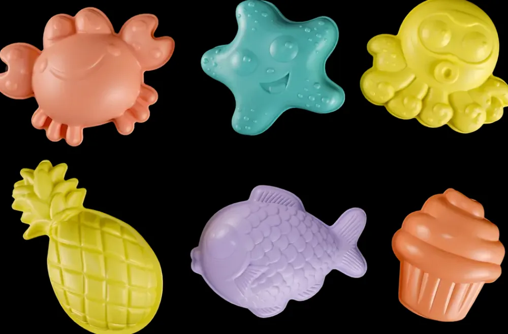 Sæt med 6 sandforme, der er formet som hhv. en krabbe, en søstjerne, en blæksprutte, en fisk, en ananas og en cupcake.Sandformene er perfekte at have med på stranden eller bruge i sandkassen.