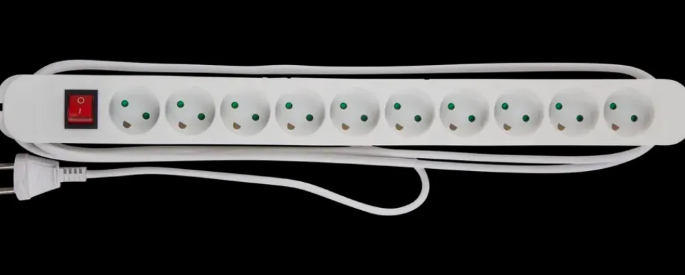 Stikdåse med 10 runde udtag, ledning og stikprop.Endvidere er stikdåsen udstyret med en afbryder så du nemt og bekvemt kan tænde og slukke for strømtilgangen.
