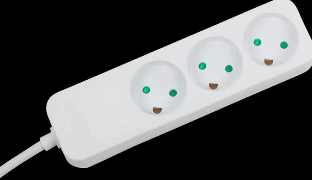 Stikdåse med 3 udtag og jordbeskyttelse samt ledning og stikprop.