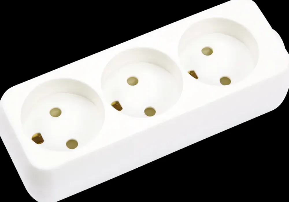 Stikdåse med 3 runde udtag og jordbeskyttelse.Stikdåsen leveres uden ledning og stikprop.Disse kan tilkøbes i den ønskede længde og type.