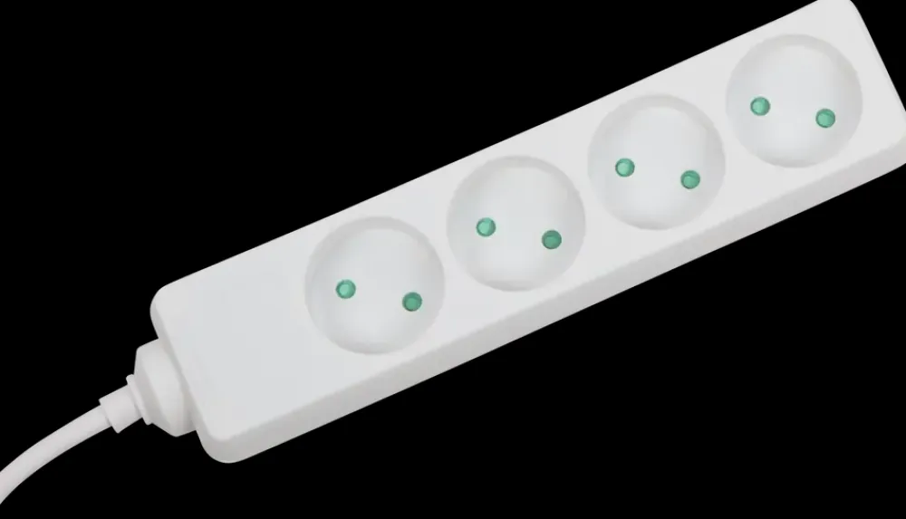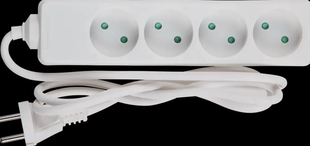 Stikdåse med 4 udtag samt ledning og stikprop.Maks. 16 A, 3500W.