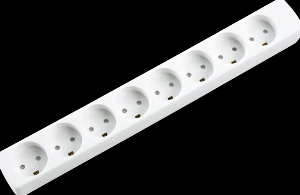 Stikdåse med 8 runde udtag og jordbeskyttelse.Stikdåsen leveres uden ledning og stikprop.