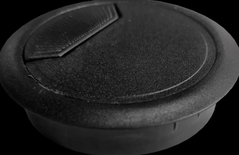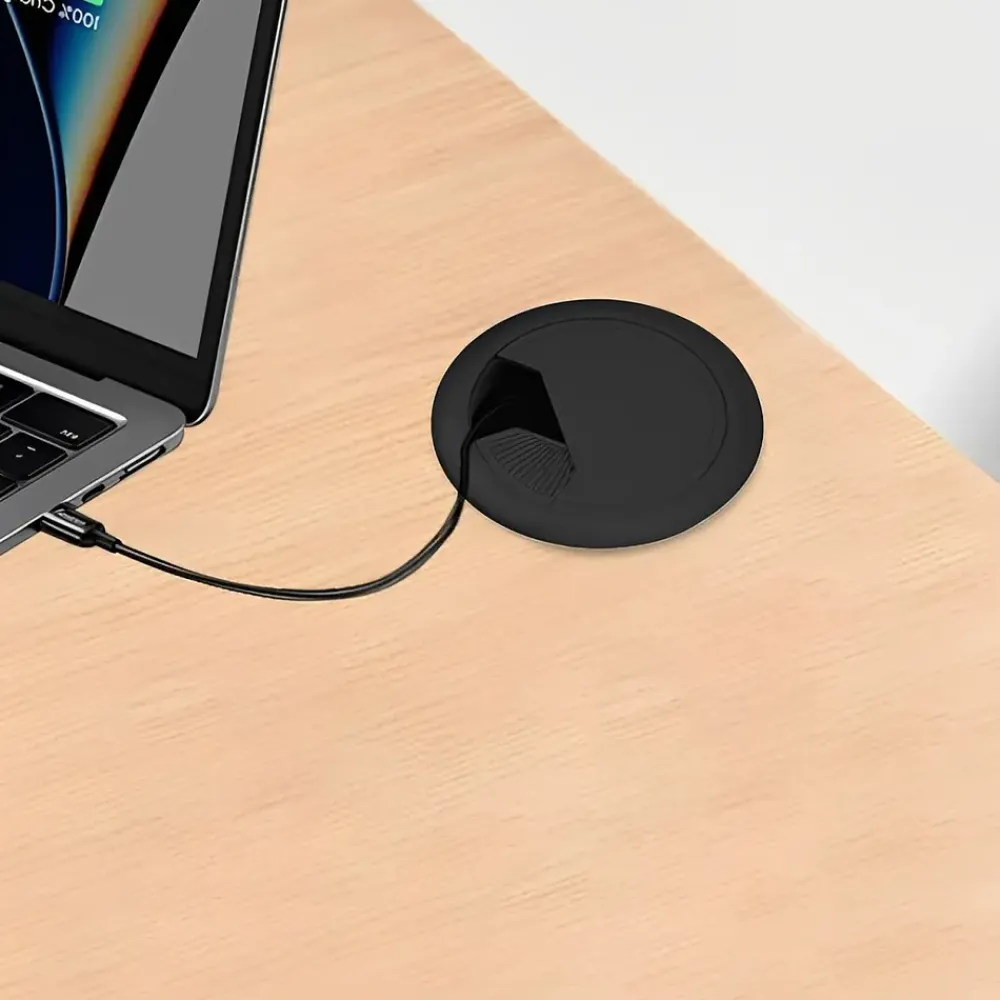 Rund kabelgennemføring til nem og praktisk organisering af kabler og ledninger. Monteres i en bordplade med et forboret hul på Ø60 mm og sikrer en ryddelig arbejdsstation. Kabelgennemføringen er fremstillet i sort plast og har et udvendigt mål på Ø71 mm. Den har et aftageligt dæksel, som kan tilpasses til forskellige kabelstørrelser eller fjernes helt for større gennemføringer.