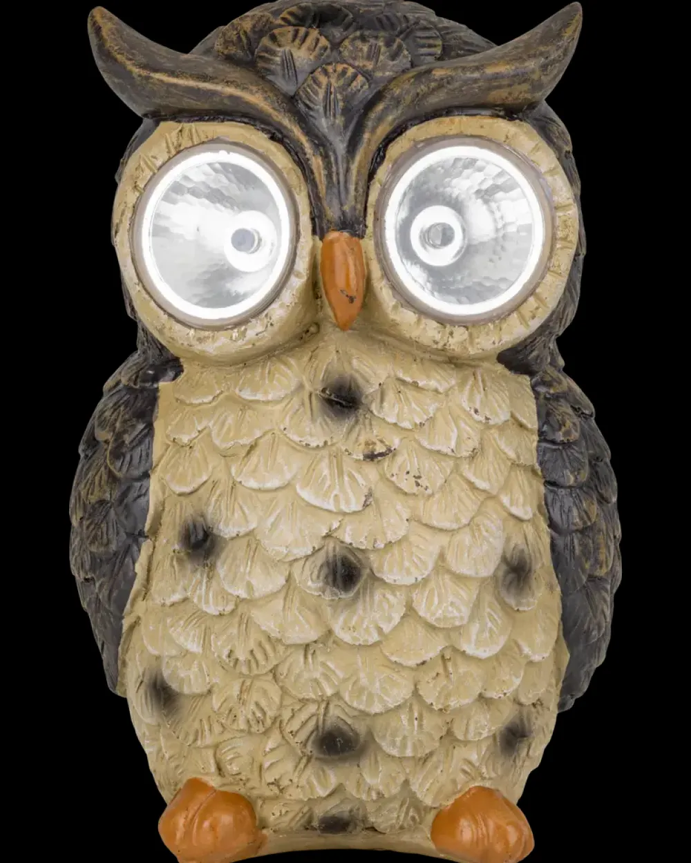 Charmerende ugle med solcellepanel og 1 stk. LED i hvert øje. Skaber stemning og lys i haven når mørket falder på.Udarbejdet i holdbart polyresin, der tåler både vind og vejr.