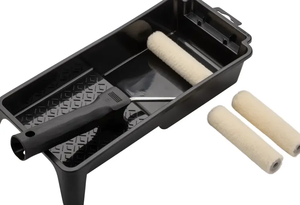 Malerrullesæt velegnet til lakmaling, bestående af:1 stk. malerbakke.1 stk. rulleskaft.3 stk. valser: B. 10 cm.