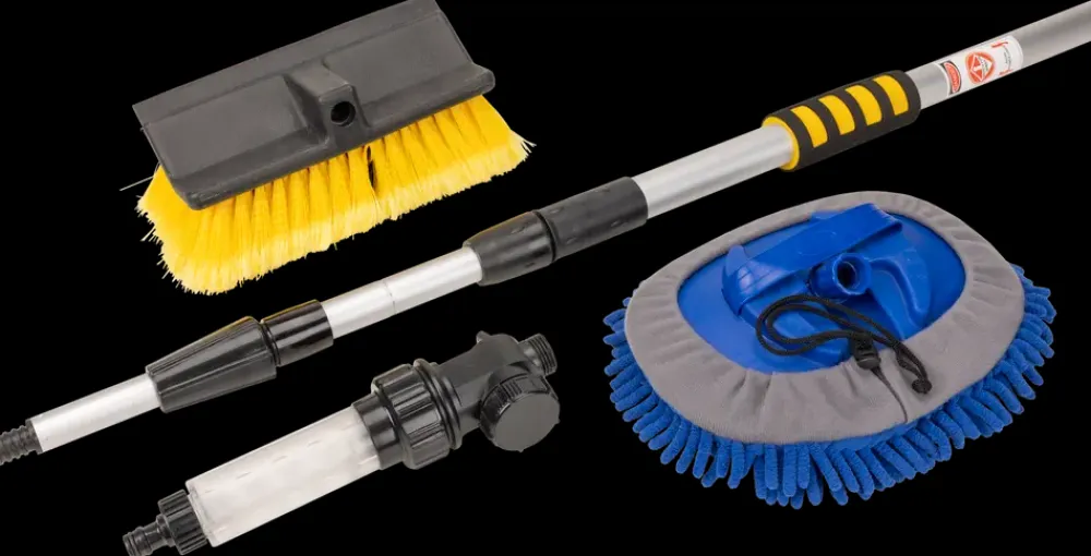 Multifunktionsvasker med teleskophåndtag til udendørs rengøringsopgaver. Velegnet til bl.a. solpaneler, vinduer, campingvogne og større flader.Sættet indeholder to børstehoveder: plastbørste og mikrofiberklud, så du kan tilpasse rengøringen efter overfladen.Håndtaget kan justeres fra 1,97 til 5 meter og gør det nemt at nå høje områder. Den indbyggede sæbedispenser gør det muligt at tilføre rengøringsmiddel direkte under brug.Universalvaskeren tilsluttes en haveslange med standardkobling, som giver en jævn vandtilførsel.Materialer: Aluminium (skaft/teleskopstang), plast (koblinger, sæbedispenser og dele af børstehoved), mikrofiberklud (det ene børstehoved).