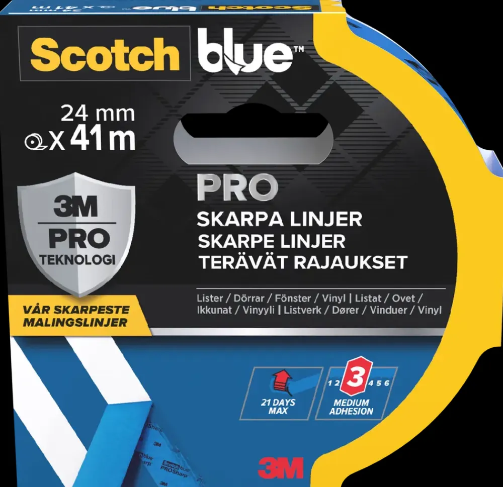 ScotchBlue™ PRO malertape er en afdækningstape udviklet til maleropgaver, hvor der stilles krav til skarpe og ensartede linjer. Tapen kan anvendes både indendørs og udendørs og er velegnet til præcisionsarbejde på flere typer overflader.Malertapen har klæbeevne niveau 3 (middel), som giver sikker vedhæftning under arbejdet uden at hæfte unødigt hårdt. Som afdækningstape kan den bruges på vægge, døre, vinduer, fodpaneler og vinyl, hvor den bidrager til knivskarpe malerkanter. Tapen er fleksibel og nem at tilpasse langs lister, kanter og overgange, og den kan rives over i hånden uden brug af værktøj.Den blå PRO-tape er UV-bestandig og kan anvendes på områder, der udsættes for sollys. Afdækningstapen kan fjernes igen uden at efterlade klæberester i op til 21 dage efter påsætning, afhængigt af underlag og forhold.Tekniske detaljer og målBredde: 24 mmLængde: 41 mFarve: BlåKlæbeevne: 3 (middel)Anvendelse: Indendørs og udendørs