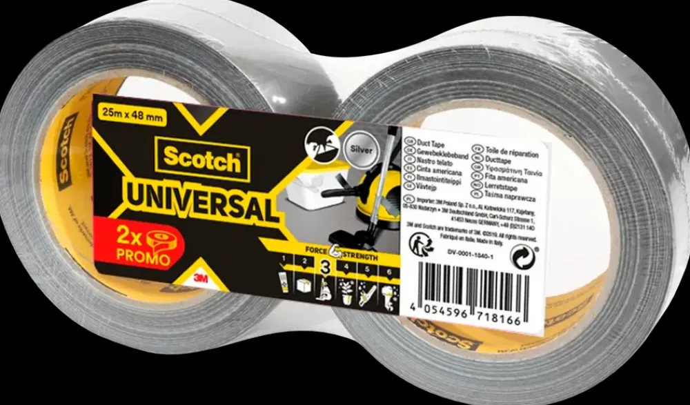 Scotch® Extremium™ Universal lærredstape er en alsidig tape til reparation, fastgørelse og bundtning i både hjemmet og værkstedet. Tapen anvendes til midlertidige og permanente løsninger, hvor der stilles krav til styrke og fleksibilitet, og den egner sig til mange typer opgaver.Tapen har en forstærket bagbeklædning, som gør den modstandsdygtig og samtidig nem at forme omkring kanter, hjørner og ujævne overflader. Den klæber sikkert på overflader som plast, papir, træ og metal. Overfladen kan mærkes med næsten alle tuschpenne, hvilket gør det nemt at identificere kabler, reparationer eller samlinger.Scotch® Extremium™ Universal lærredstape kan rives over i hånden uden brug af værktøj. Den bruges ofte til reparation af mindre elektronik, samling af kabler, midlertidig forsegling af slanger samt andre montage- og vedligeholdelsesopgaver.Tekniske detaljer:Bredde: 48 mmLængde: 25 m pr. rulleAntal: 2 rullerFarve: Sølv