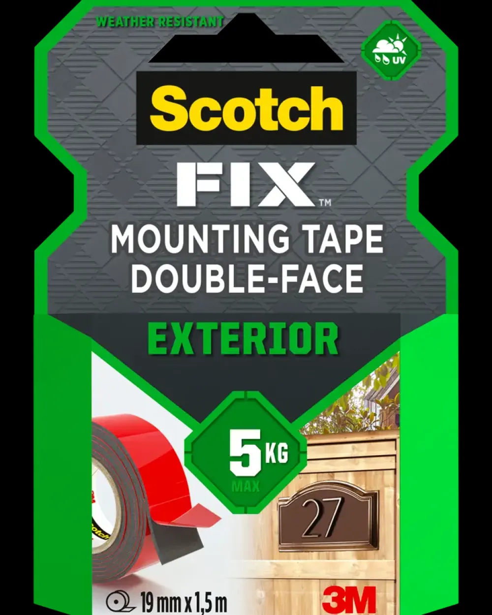 Scotch-FIX™ dobbeltklæbende monteringstape er beregnet til udendørs montering, hvor der stilles krav til holdbar og permanent fastgørelse under skiftende vejrforhold. Tapen anvendes til montering af mindre til mellemstore genstande som husnumre, skilte, kroge og lette udendørs elementer uden brug af skruer eller boring.Tapen er sort og egnet til montage, hvor fastgørelsen ønskes mindre synlig på mørke overflader. Den er UV-bestandig og udviklet til at modstå vind, regn og temperatursvingninger. Tapen fungerer på metal, malet eller behandlet træ samt akryl og giver en stabil fastgørelse, når overfladen er ren og tør.Med en maksimal bæreevne på op til 5 kg er tapen velegnet til permanente udendørs monteringsopgaver, hvor belastningen fordeles jævnt over tapens længde.Mål: B. 19 mm x L. 1,5 mFarve: SortAnvendelse: UdendørsMaks. belastning: 5 kg