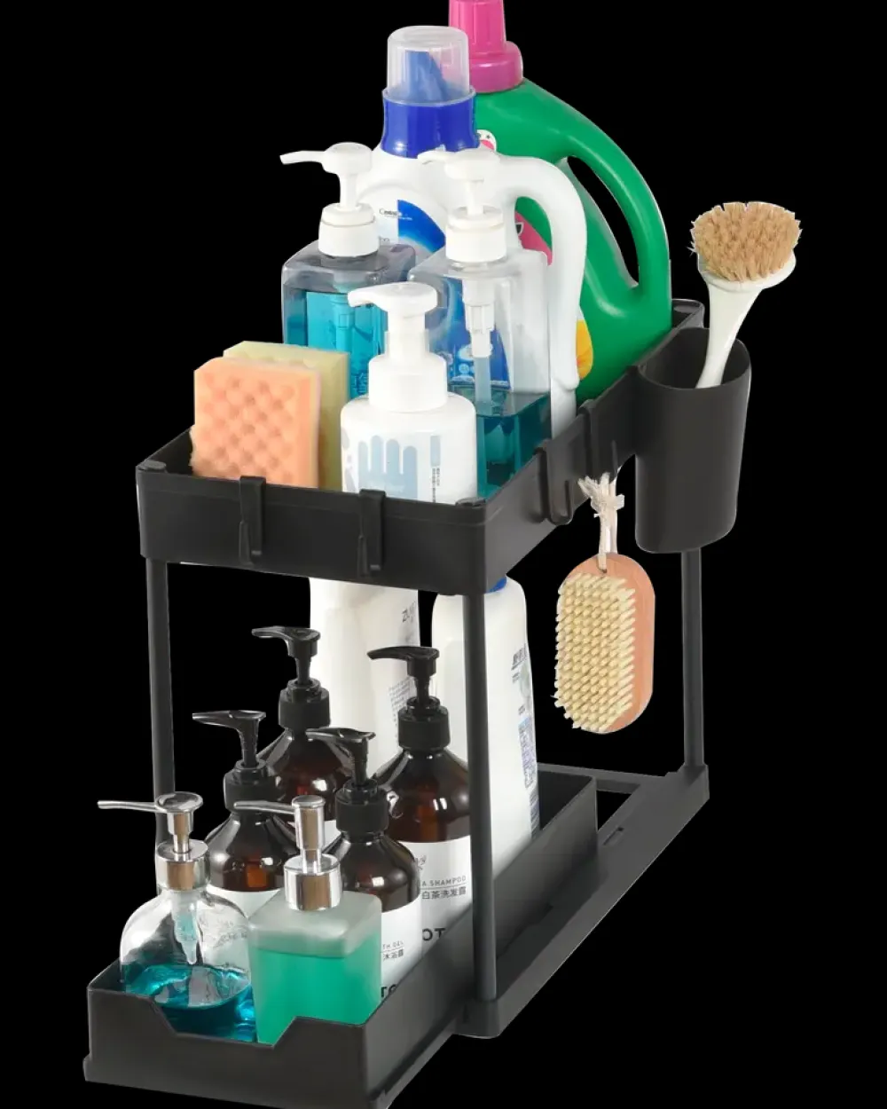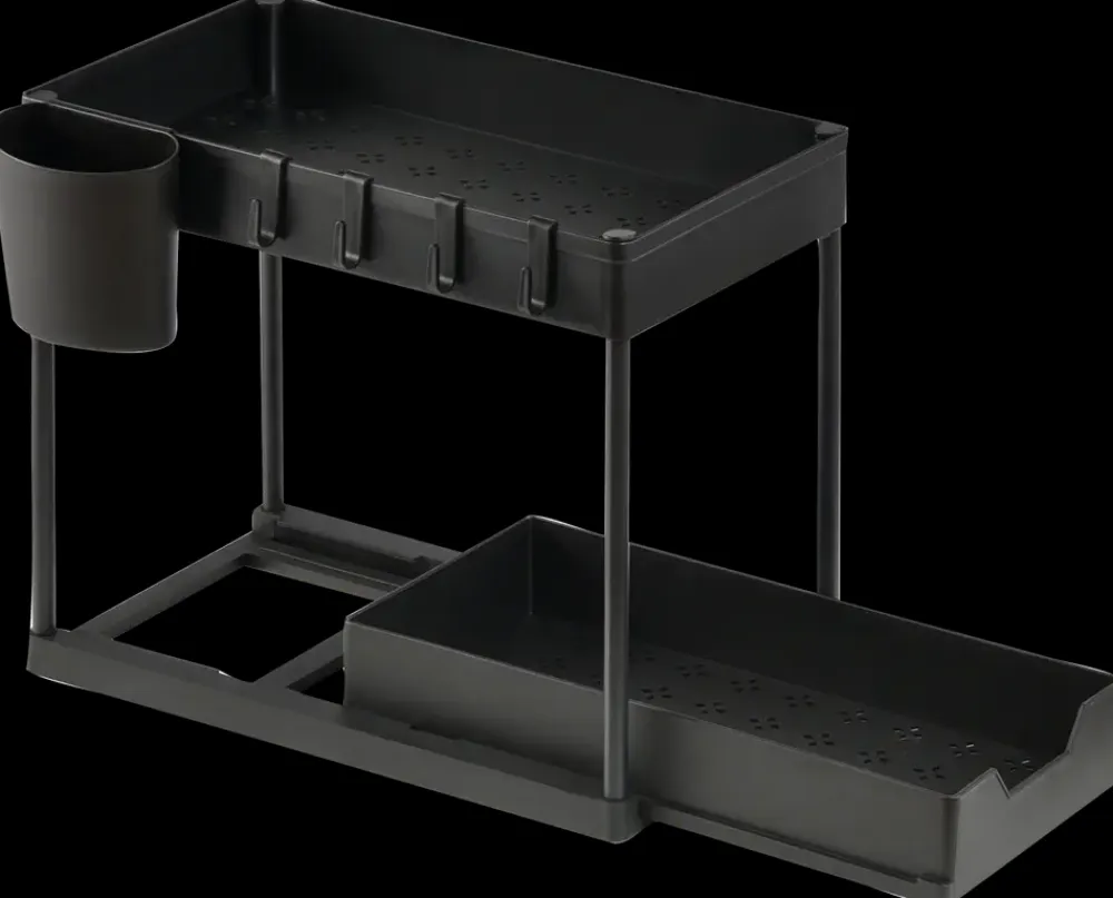 Funktionelt opbevaringsstativ med to hylder, velegnet til organisering af rengøringsmidler, flasker og småartikler i køkken, badeværelse eller bryggers. Stativet kan også placeres inde i et skab og fungerer som ekstra indretning til udnyttelse af pladsen.Det dobbelte hyldedesign giver mulighed for opdeling af indholdet i niveauer, mens fire kroge og en sidelomme tilføjer ekstra opbevaringsplads til mindre genstande. Den nederste hylde kan trækkes ud, hvilket giver nem adgang til indholdet – også bagerst. Drænhuller i bunden sikrer ventilation og reducerer fugt.Fremstillet i plast (PP) og stål for en let, men stabil konstruktion. Samles nemt uden brug af værktøj.Mål (samlet): H36 x B22 x L40 cm.Farve: Sort.